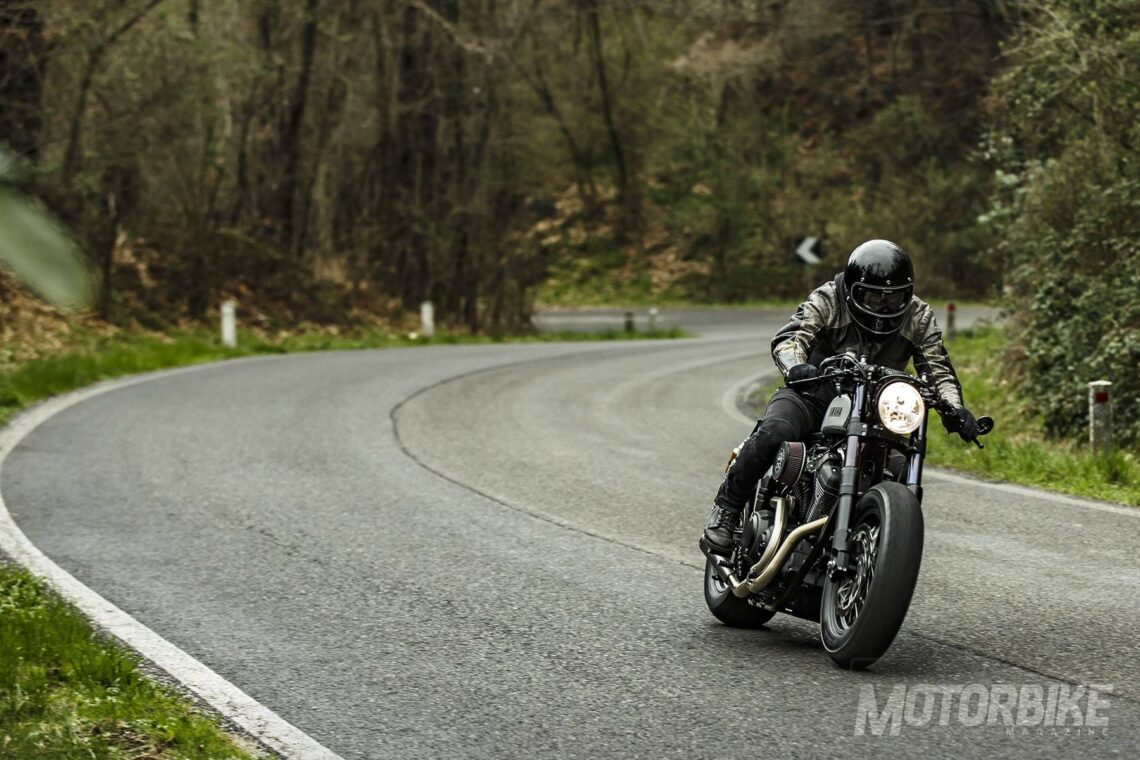 l diseño es contundente, pero con unas líneas delicadas. Los neumáticos tipo donut son importantes en el conjunto, pero no llegan a afectar a la conducción. Por eso son de generosas dimensiones y se han montado sobre unas llantas Borrani, además de contar con la horquilla de la Yamaha VMax.
