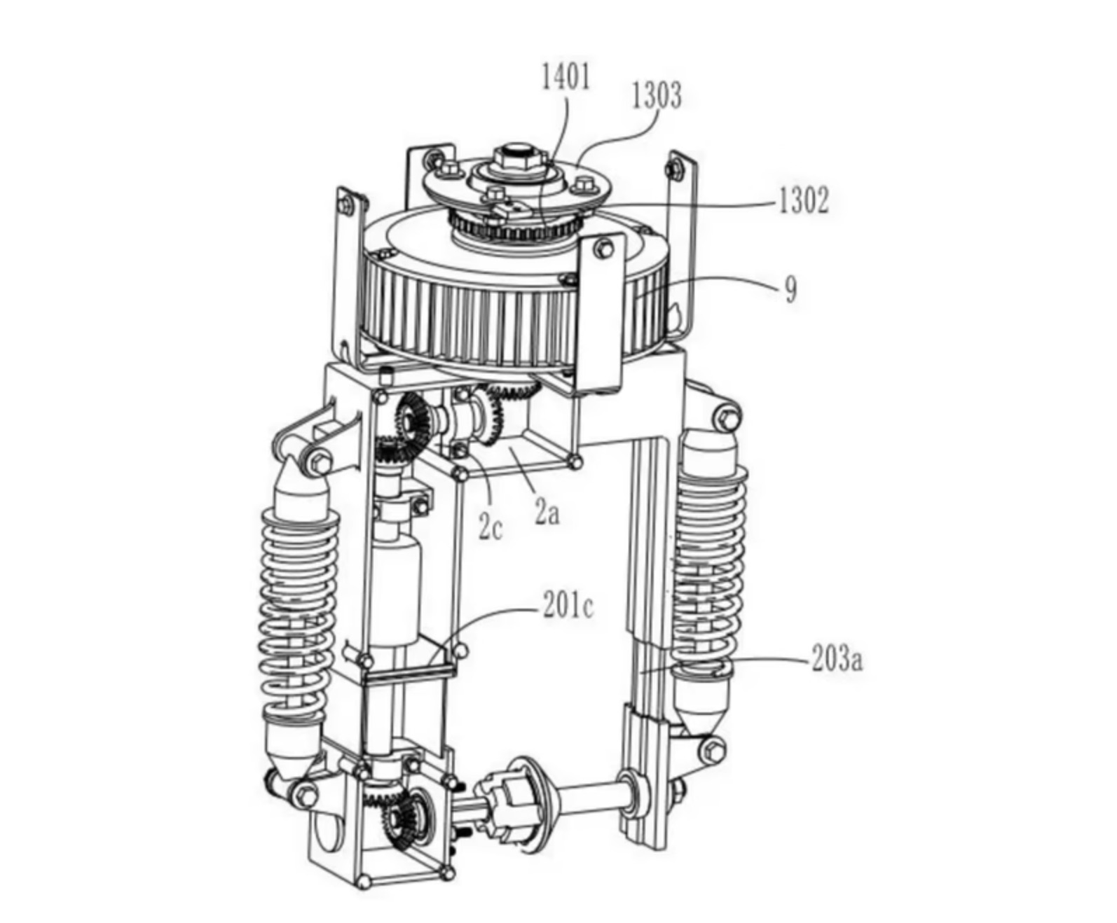 En cuanto a la transmisión para uso por tierra está provista de un elemento de compensación que permite un movimiento vertical telescópico mientras sigue ofreciendo la motricidad, todo ello a través de los mencionados engranajes.